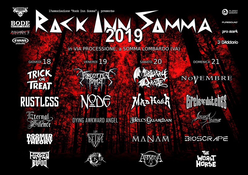 Dopo l'annuncio degli headliner, l'associazione Rock Inn Somma ha svelato tutte le altre band che andranno a comporre la line-up definitiva del festival che quest'anno si svolgerà per la quattordicesima volta. Rock Inn Somma 2019 si svolgerà, come da qualche anno a questa parte, presso l'area situata in via Processione, a Somma Lombardo (VA), nei giorni dal 18 al 21 luglio. Come per gli anni passati, l'ingresso sarà completamente gratuito. Ad accompagnare gli headliner, che sono TRICK OR TREAT, FORGOTTEN TOMB, MORTUARY DRAPE e NOVEMBRE, ci saranno, suddivisi nelle varie serate: