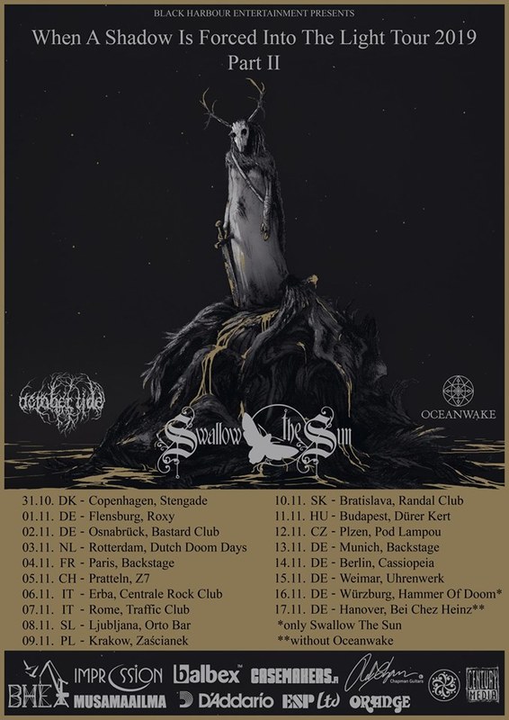 Continua il periodo di promozione dell'ultimo album della band finlandese SWALLOW THE SUN, 'When A Shadow Is Forced Into The Light', uscito all'inizio del 2019 per Century Media Records. Nel prossimo autunno la band intraprenderà un nuovo tour europeo in compagnia di band come OCTOBER TIDE e OCEANWAKE, e che farà tappa in Italia per due serate organizzate in collaborazione con No Sun Music, dettagliate di seguito.