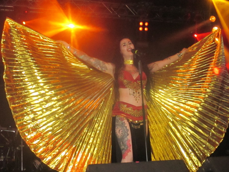 A fare da piacevole antipasto a questa speciale serata, con una presenza di pubblico ancora risicata, ci pensano gli svedesi Eleine, che sono una symphonic metal band attiva solamente da qualche anno e che hanno pubblicato nel 2015 il loro omonimo debutto discografico. La band deve il suo nome proprio grazie alla procace cantante che, insieme al resto del gruppo presente in vesti uniformi e piuttosto eleganti, si presenta sul palco come una sinuosa danzatrice del ventre bardata di tatuaggi, e rendendo quindi lo spettacolo ancora più affascinante e stuzzicante. Il loro symphonic è sui generis, miscelando aggressività, potenza, melodia e pathos atmosferico. Le linee musicali sono buone e si adagiano sulla base tastieristica che Sebastian Berglund prodiga a profusione. E la presenza di Eleine non è solo fisica, ma possiede anche certe qualità canore che la rendono interessante; la sua voce si presenta sempre lineare, ben impostata, non eccessivamente potente dal punto di vista lirico e di tonalità, ma senza particolari sbavature. Ma il pubblico, soprattutto quello maschile, viene attirato di più dalle sue movenze da odalisca del Medio Oriente, da prediletta di importanti califfi persiani, pronti a tutto pur di accontentare la bella. Inoltre, la sua voce viene alternata da un buon growl del chitarrista RIkard Ekberg, il quale tra un pezzo e l’altro intrattiene il pubblico con un’enfasi estremamente tenebrosa, pur dicendo cose normalissime. La loro performance è risultata di buon livello, e potrebbero iniziare a giocare le loro carte nel panorama del symphonic metal.
