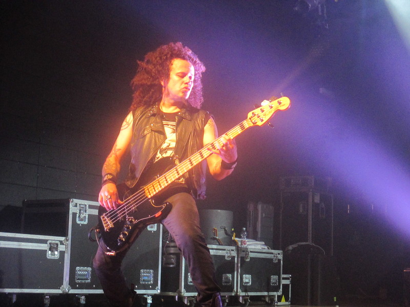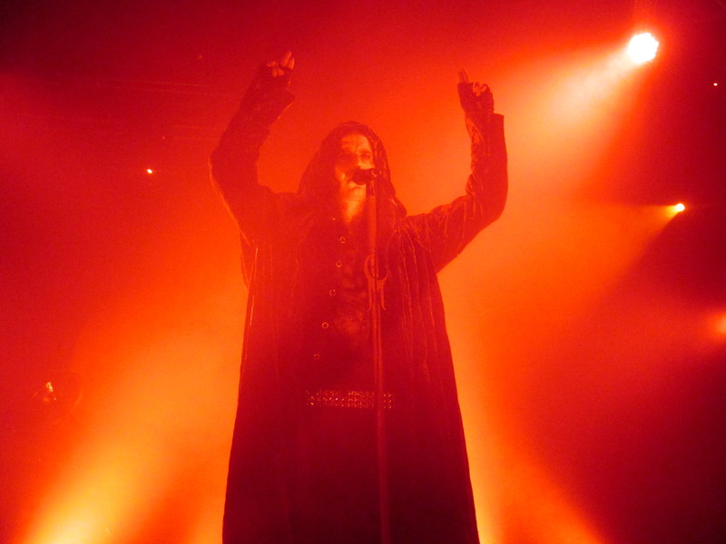 Nel frattempo la quantità di persone è visibilmente aumentata, e ciò fa crescere ancor più l’attesa per una band che già l’anno scorso in Italia ha dato prova di essere ancora in una forma smagliante, grazie al successo ed all’ottima fattura di un album come ‘Extinct’. Ma questa volta il contesto è differente, si parla di ‘Special Vintage Show’, e tutto fa presagire che i pezzi più recenti vengano messi da parte a favore di gemme di repertorio che ripercorrono la storia più fulgida dei Moonspell. La scenografia è minimale, spicca solamente un telo di medio-grandi dimensioni dove campeggia una luna piena. Ma solo quest’elemento è sufficiente perché si trascorra una serata che difficilmente verrà dimenticata. La band lusitana sale sul palco prontissima e carica per un evento denso di emozioni. Fernando Ribeiro affronta il microfono con la consueta bramosia e l’irreprensibile voglia di gridare al mondo che i veri lupi sono loro. Si inizia con “Wolfshade” ed il pubblico è già in delirio. Ribeiro con tanto di asta del microfono e Aires Pereira con le sue corde di basso sono indemoniati nel muoversi e nel rotearsi a ritmi vertiginosi. La voce di Fernando risulta da subito limpida nella sua impenetrabile oscurità, e la band è completamente compatta. Si continua con “Love Crimes” seguendo sempre lo stesso copione: affrontare i brani come se non ci fosse un domani, distribuendo passione musicale verso ogni angolo della platea. Quando si capisce che i pezzi successivi sono “…of Dreams And Drama”, “Lua d’Inverno” e “Trebraruna”, una domanda dal più recondito angolo del cervelletto sorge spontanea: ma non che i Lupi lusitani mi sciorinano tutto ‘Wolfheart’ dall’inizio alla fine? E in effetti, quando Ribeiro torna sul palco dopo una breve pausa bardato del suo classico mantello, interpretando le note della paurosa “Vampiria”, si palesa nei nostri corpi la sensazione che qualcosa di magico stia accadendo. ‘Wolfheart’ interpretata per intero, e l’emozione invade gli occhi di ognuno. Il colore predominante di “Vampiria” è il rosso, quel rosso sangue incredibilmente acceso che incornicia il contesto terrificante che il brano rende tangibile. Dopo aver ripescato addirittura la bonus track “Ataegina”, tratta dalla ristampa dell’album del 2008, e dopo un’ottima “An Erotic Alchemy”, ecco scatenarsi la folla al ritmo incalzante di “Alma Mater”, con il sottoscritto che a momenti invade il palco a forza di headbanging; un brano dalla potenza disumana che spazza via come un uragano ogni velleità di tranquillità.