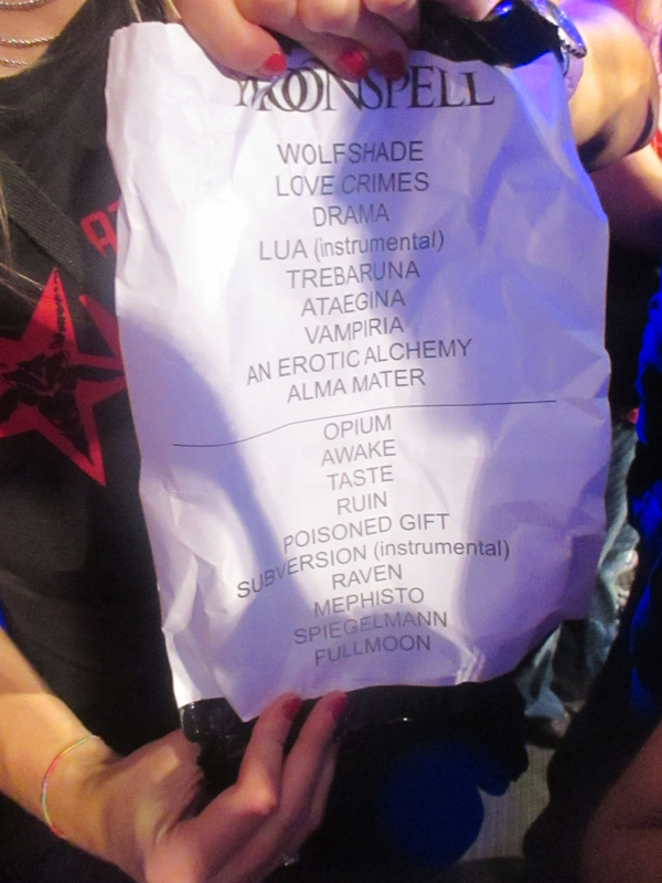 Qualcuno potrebbe pensare che qualce brano più recente venga proposto, ma quando la band torna sul palco questi pensieri vengono prontamente smentiti. Perché i Moonspell tornano suonando “Opium”. Ed è di nuovo delirio, tutta la folla canta festante ed asseconda i movimenti di Ribeiro come un corpo all’unisono. Dopo “Opium” la musica rimane, e sono le tastiere di Pedro Paixao a ricoprire come un mantello scarlatto lo stage del Live Club. Sono le tastiere che introducono “Awake!”, e un’altra domanda sorge spontanea: ma non è che, dopo ‘Wolfheart’, vogliano fare tutto ‘Irreligious’? La risposta alla domanda è presto detta: dopo “Awake!” è la volta di “For A Taste Of Eternity”, “Ruin And Misery” e “A Poisoned Gift”. Sì, faranno anche tutto ‘Irreligious’, per una serata assolutamente indimenticabile. Sulle note di “Raven Claws” il pubblico salta imbizzarrito, e sugli scudi si presenta la chitarra inebriante di Riccardo Amorim, praticamente perfetto per tutta la serata. Ci si avvicina verso il termine non solo dello show, ma anche delle inutili e fragili vite, perché arriva la coltre impietosa di “Mephisto”. E la malvagità si percepisce densa e pregna come la pece. Sulle note, ma soprattutto sull’ululato notturno di “Full Moon Madness” cala il sipario su uno show da ricordare negli annali. Uno show che l’Italia ha avuto l’onore di assistere in esclusiva, dato che è solo per il concerto di Trezzo che viene proposta una setlist del genere. Non si pensava uno “Special Vintage Show” di siffatta fattura. A vent'anni dalla loro pubblicazione, 'Wolfheart' e 'Irreligious' sono album che ancora oggi generano tra gli appassionati degli stimoli e delle sensazioni da cardiopalmo. Un’occasione che molto difficilmente si potrà ripetere in futuro, enfatizzando ancor di più l’orgoglio di essere riusciti ad assistere e ad essere presenti, con il corpo e con lo spirito, ad un cerimoniale del genere. Quasi due ore di musica inebriante da marchiarsi col fuoco tra gli show dell’anno. La foto della setlist spiega tutto.