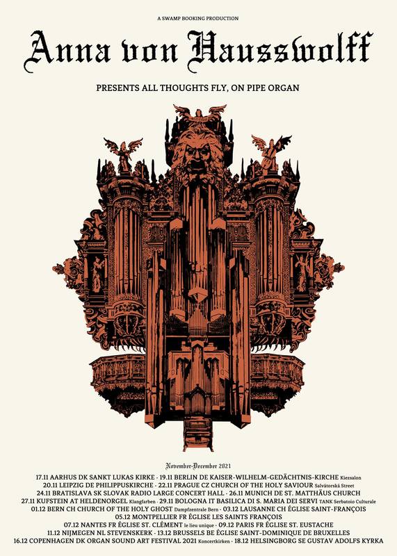 La musicista svedese ANNA VON HAUSSWOLF, con il supporto dell'agenzia Swamp Booking, presenterà dal vivo il suo ultimo album 'All Thoughts Fly' con delle performance tutte particolari. Infatti, tra novembre e dicembre 2021 suonerà all'interno di location quali cattedrali e chiese storiche, montagne e spazi orchestrali, dove saranno presenti degli organi a canne che la musicista suonerà personalmente. Il tour consisterà in 17 diverse date in giro per l'Europa, ed in ciascuna di queste location sono presenti organi diversi per dimensioni ed epoca. Di conseguenza, ogni concerto differirà dall'altro, per una tournée estremamente varia. ANNA VON HAUSSWOLF farà tappa anche in Italia, precisamente nella Basilica di Santa Maria dei Servi a Bologna, il prossimo 29 novembre. Di seguito il flyer ufficiale con tutte le date.