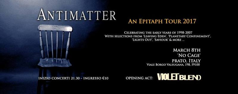 La rock band britannica ANTIMATTER, in collaborazione con Associazione No Cage, DegeneRock e Rapsodia in Blu Agency, ha annunciato una nuova data in Italia che andrà ad affiancarsi a quella precedentemente annunciata del 7 marzo al Blueshouse di Milano. La band capitanata da Mick Moss si esibirà il giorno seguente, 8 marzo, al No Cage Club di Prato, e si inserirà nell'ambito dell'Epitaph Tour 2017, che celebrerà il periodo 1998-2007 interpretando brani tratti da album quali 'Leaving Eden', 'Planetary Confinement', 'Saviour', 'Lights Out', e tanto altro.. Ad aprire il loro concerto ci saranno i fiorentini VIOLET BLEND, che per l'occasione presenteranno il nuovo album 'White Mask'. Di seguito il programma: