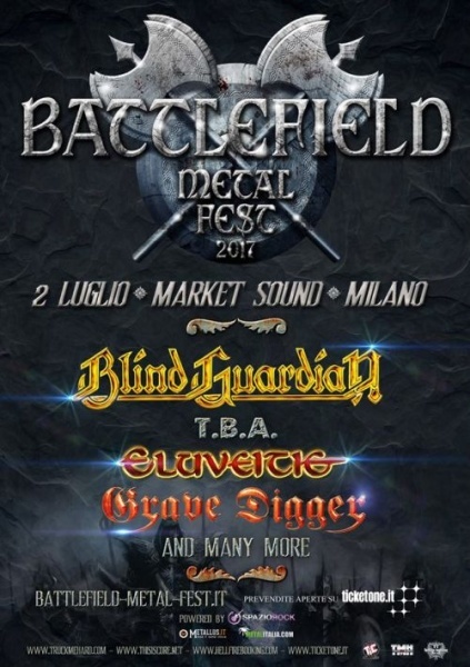 Si aggiorna di notizie importanti la prima edizione del Battlefield Metal Fest, che si terrà il prossimo 2 luglio 2017 a Milano. Ad aggiungersi alle due rinomate band già confermate precedentemente, vale a dire i BLIND GUARDIAN e i GRAVE DIGGER, saranno della partita anche i folk-metallers svizzeri ELUVEITIE, che si presenteranno quindi con la loro rinnovata line-up. L'altra importante notizia riguarda la location: il Battlefield Metal Fest si terrà nella prestigiosa location all'aperto del Market Sound di Via Cesare Lombroso a Milano. Di seguito i dettagli dell'evento: