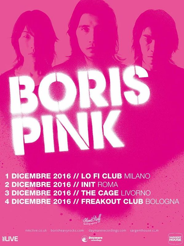 La rock band giapponese BORIS ha da poco ristampato il loro lavoro più acclamato, 'Pink', originariamente pubblicato nel 2005. Per quest'occasione la band intraprenderà un tour europeo tra novembre e dicembre, dove riproporrà per intero i pezzi di quest'album. Ci saranno anche quattro date in Italia, di seguito riportate:
