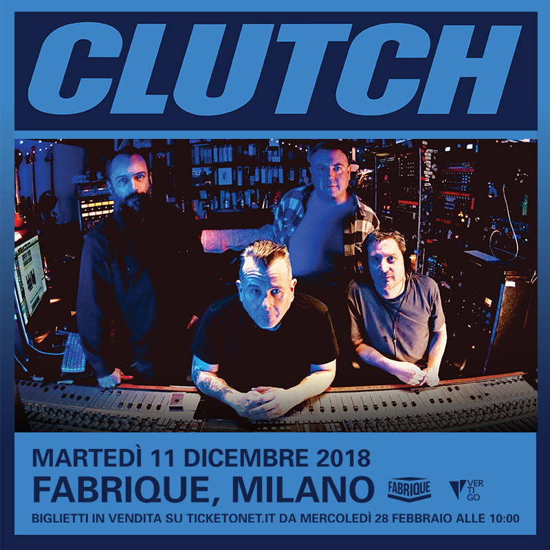 La stoner metal band americana CLUTCH è attualmente alle prese con la registrazione del nuovo album, a distanza di tre anni dal precedente 'Psychic Warfare', e che sarà previsto per la metà di quest'anno. Per l'occasione hanno annunciato un tour nei mesi di novembre/dicembre 2018, e che farà tappa anche in Italia il prossimo 11 dicembre, presso il Fabrique di Milano, in collaborazione con Vertigo. I biglietti saranno in vendita a partire dalle ore 10:00 di mercoledì 28 febbraio, presso la piattaforma Ticketone.