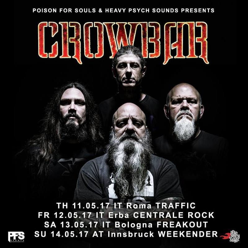 In collaborazione con Heavy Psych Sounds Booking e Poison For Souls, sono state annunciate le date italiane della leg europea del tour della heavy metal band statunitense CROWBAR. La band ripercorrerà i suoi 20 e più anni di carriera, compreso l'ultimo album 'The Serpent Only Lies', uscito nell'ottobre 2016 per l'etichetta E1 Music. La band verrà in Italia per tre date che saranno le seguenti: