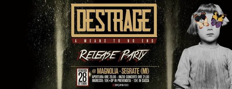 La metalcore band italiana DESTRAGE pubblicherà il nuovo album intitolato 'A Means To No End' il prossimo 21 ottobre per l'etichetta Metal Blade Records. Per celebrare l'imminente uscita, la band farà un release party dal vivo venerdì 28 ottobre al Circolo Magnolia di Segrate (MI) dove verrà presentato l'album nuovo e svelati dal vivo i pezzi. A breve verranno annunciati i gruppi di supporto. Di seguito i dettagli della serata: