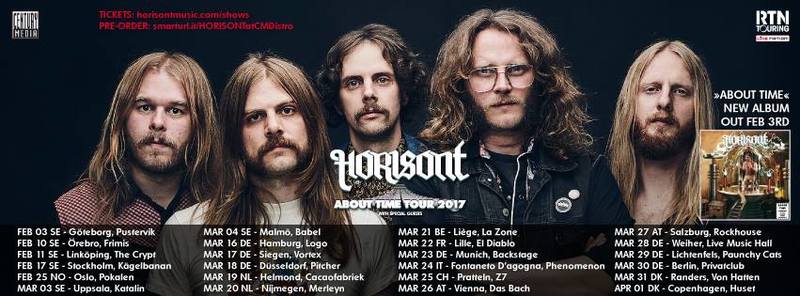 La vintage rock band svedese HORISONT ha recentemente aggiornato le date del prossimo tour europeo di supporto al nuovo album 'About Time' in uscita il prossimo 3 febbraio per Century Media, e che partirà proprio il giorno stesso della pubblicazione da Goteborg. Le date aggiunte sono quelle del 25 febbraio al Pokalen di Oslo in Norvegia, e quella che ci riguarda più da vicino, vale a dire quella del 24 marzo al Phenomenon di Fontaneto d'Agogna (NO). Di seguito i dettagli della data italiana, il flyer aggiornato del nuovo tour e la copertina di 'About Time':