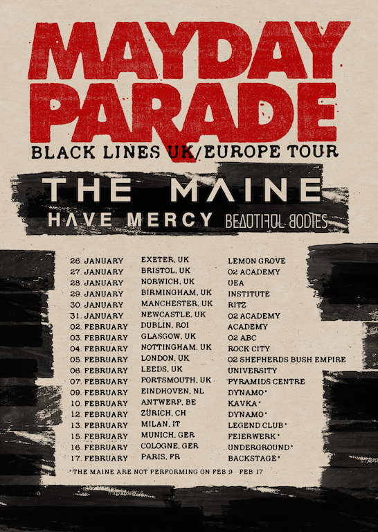 I Mayday Parade celebreranno l'uscita del loro nuovo album con ‘Black Lines UK/Europe Tour’, tour che li vedrà impegnati in Europa nel mese di febbraio accompagnati da Have Mercy e Beautiful Bodies. Il cantante e batterista Jake Bundrick ha così commentato: "Siamo estremamente eccitati di tornare presto in Europa. Abbiamo vissuto esperienze fantastiche nei nostri precedenti tour e non vediamo l'ora di viverne nuove. E' sempre tutto molto speciale quando si arriva in Europa, ci vediamo presto!".