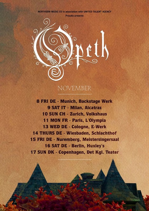 In vista della pubblicazione del nuovo album prevista per quest'album, la progressive metal band svedese OPETH intraprenderà un breve tour europeo nel mese di novembre finalizzato alla sua promozione. Ci sarà anche una data in Italia, fissata per il prossimo 9 novembre all'Alcatraz di Milano, in collaborazione con Vertigo. Di seguito i dettagli della data italiana e il flyer del tour.
