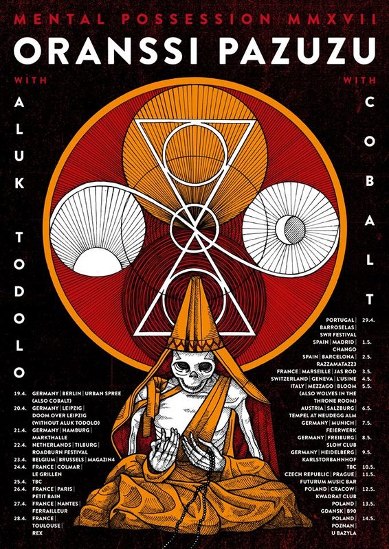 L'atmospheric black metal band finlandese ORANSSI PAZUZU ha annunciato di intraprendere il Mental Possession MMXVII Tour, un tour europeo che li terrà impegnati tra aprile e maggio in compagnia di valide band. Dal 19 al 28 aprile la band finlandese girerà tra Germania, Belgio e Francia assieme al rock occulto dei francesi ALUK TODOLO, mentre dal 29 aprile al 14 maggio attraverseranno diversi paesi, tra cui l'Italia, in compagnia del black metal degli statunitensi COBALT. Esclusivamente per la data italiana, in programma il prossimo 5 maggio al Bloom di Mezzago (MI), oltre ai COBALT, gli ORANSSI PAZUZU avranno un supporto d'eccezione: il black metal delle impenetrabili foreste americane impersonificato dai WOLVES IN THE THRONE ROOM, per una serata da non perdere. Di seguito i dettagli della data italiana ed il flyer del tour: