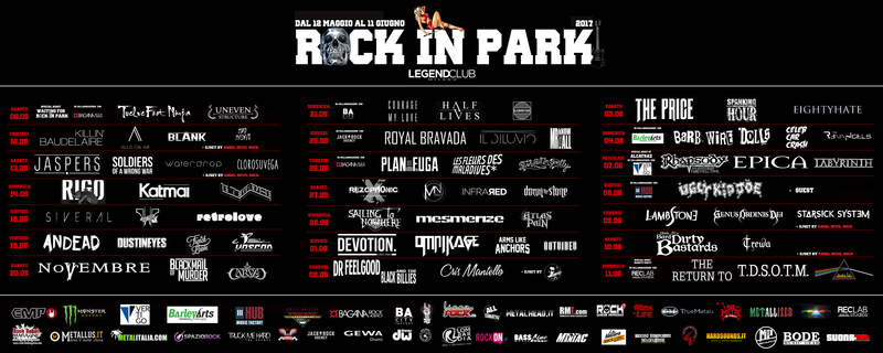 "Dal 12 maggio all'11 giugno torna l'imperdibile appuntamento col festival più alternative, metal, rock di Milano. L'estate sta arrivando e con essa l'8° edizione del Rock In Park, ormai divenuto non solo un appuntamento ma una certezza della musica alternative nel milanese. Il Rock In Park è una realtà in continua crescita e, per quest'edizione, sono stati convocati, oltre a gruppi molto apprezzati dell'underground italiano, anche performers di fama internazionale. Il Legend Club offrirà un'anteprima del festival il 6 maggio con i TWELVE FOOT NINJA (AUS) e gli UNEVEN STRUCTURE (FRA), un evento da non perdere! Da comunicato Bagana Rock Agency: "...un mix unico tra hard rock, progressive metal, alternative rock, funk e tantissimo altro. Dal vivo sono semplicemente imperdibili. Qualcosa che sicuramente ancora non avete visto...". Quest'anno, oltre ad ascoltare la miglior musica live underground per un mese intero, presenzieranno food-trucks nel palco antistante alla sala concerti per due week-ends: il primo in apertura, dal 12 al 14 maggio, e il secondo in chiusura, dal 9 all'11 giugno. Anche per questa serie di date gli organizzatori hanno dato il massimo coinvolgendo nomi noti e non, da seguito internazionale a quello più di nicchia, per garantire a chi ci segue e sostiene sempre il nostro "marchio di fabbrica"."