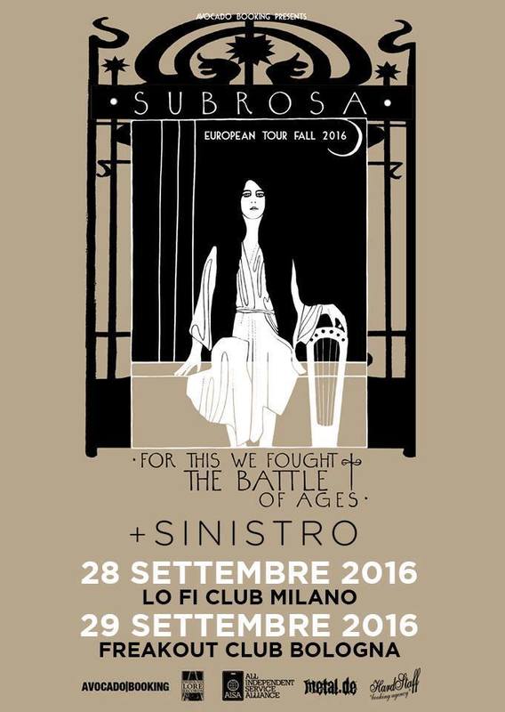 La doom metal band statunitense SUBROSA pubblicherà il prossimo 26 agosto il nuovo album dal titolo 'For This We Have Fought The Battle Of Ages', per l'etichetta Profound Lore Records. Per supportare il nuovo album, la band intraprenderà un tour in Europa e in Nord America nel prossimo autunno, che toccherà anche l'Italia per due date: il 28 settembre all'Arci Lo Fi di Milano, e il 29 settembre al Freakout di Bologna. I SUBROSA verranno affiancati per queste due date dalla black metal portoghese SINISTRO. Di seguito i dettagli degli show: