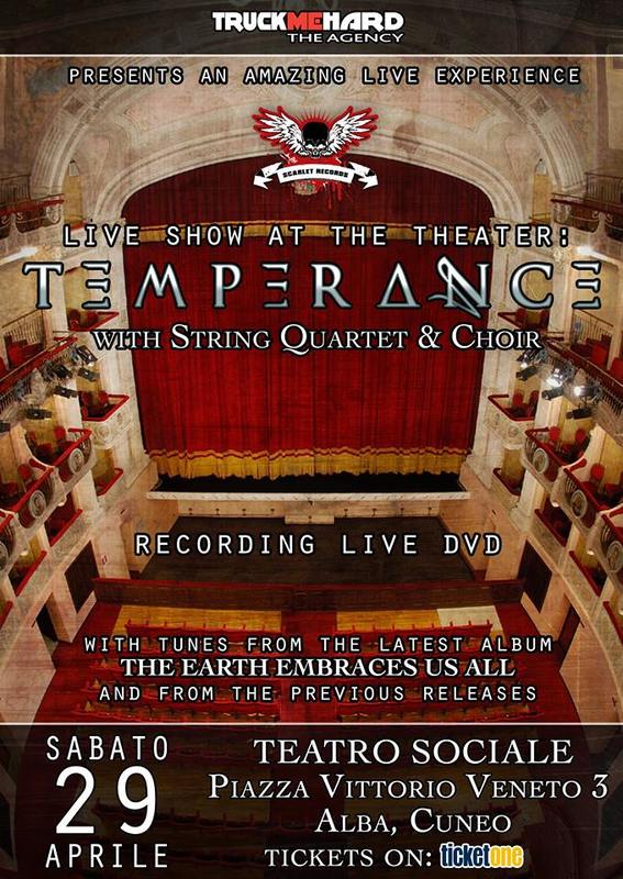 La melodic metal band italiana TEMPERANCE ha programmato uno show speciale per la prossima primavera, che sarà registrato per una futura pubblicazione su dvd. La band affronterà il palco nella pittoresca cornice del Teatro Sociale di Alba (CN), nella serata del 29 aprile, un teatro che segnerà un importante passo nella veloce, ma positiva carriera dei TEMPERANCE, e che seguirà il successo ottenuto con il loro terzo album 'The Earth Embraces Us All', il tour europeo di supporto ai LUCA TURILLI'S RHAPSODY, e gli show di supporto a NIGHTWISH, EPICA e molti altri. I biglietti sono già disponibili sul sito http://www.ticketone.it/biglietti.html?affiliate=ITT&doc=artistPages%2Ftickets&fun=artist&action=tickets&erid=1819837&includeOnlybookable=false&x10=1&x11=temperance al prezzo di 27,50€.